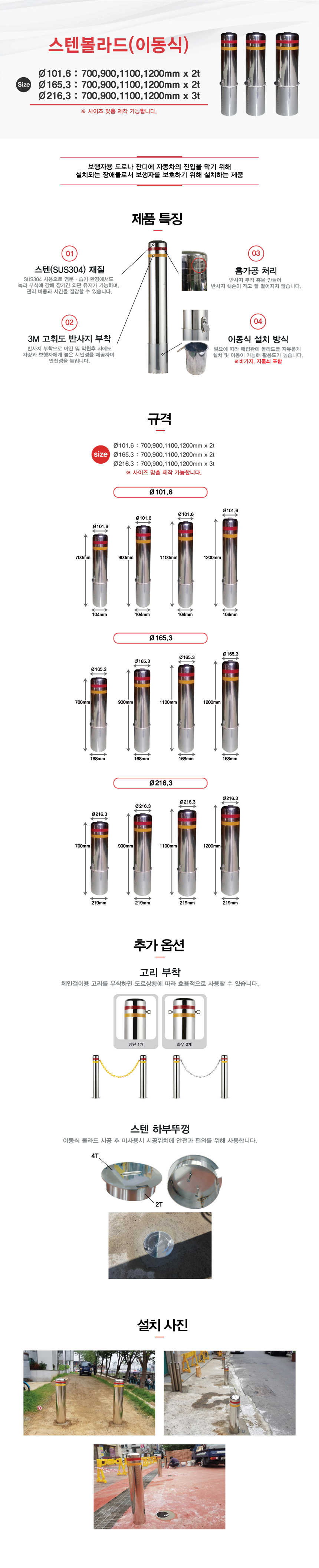 - 스텐볼라드Ø216(이동식)사이즈 -