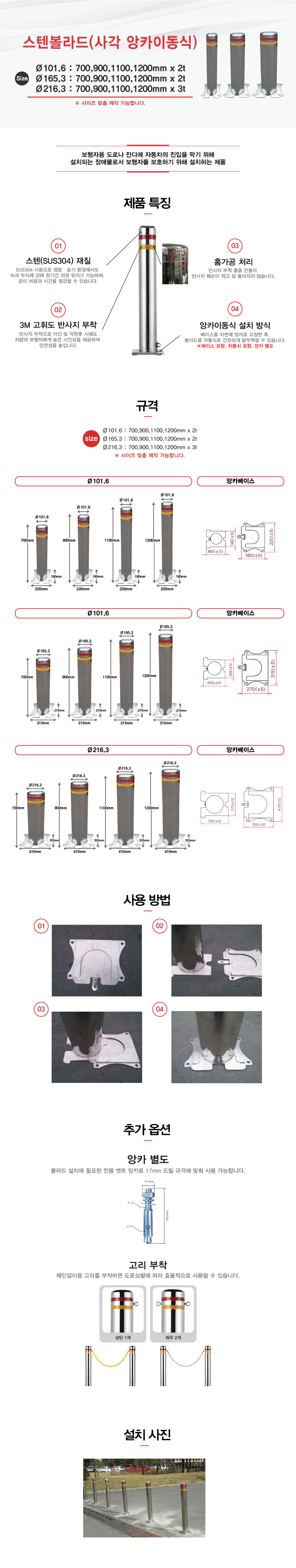 - 스텐볼라드앙카이동식 Ø216 /사각 사이즈 -