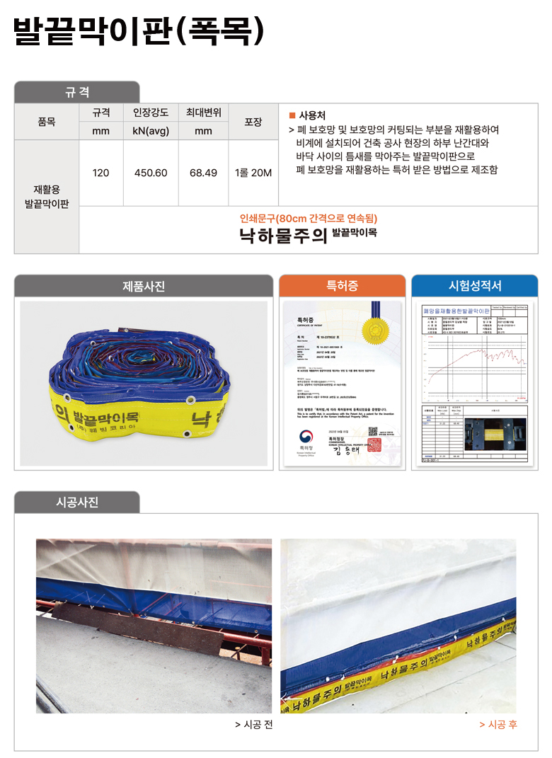 공사현장 하부난간대와 바닥사이의 틈새를 막아주는 발끝막이판